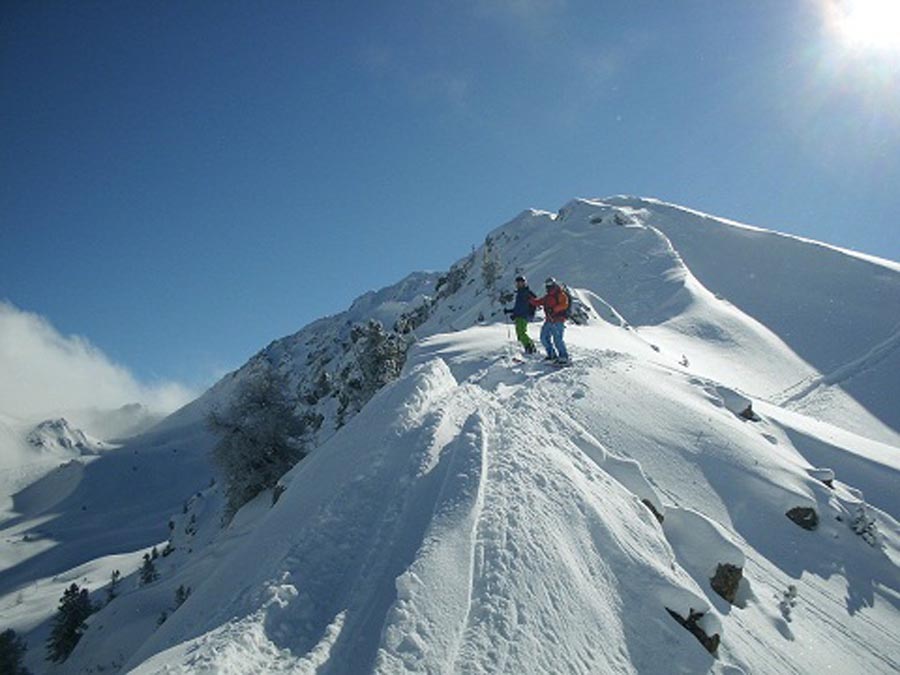 Часто на больших высотах ветер часто оставлял склоны голыми или слегка присыпанными свежим снежком, поэтому к сожалению без царапин на скользяке обойтись не удалось