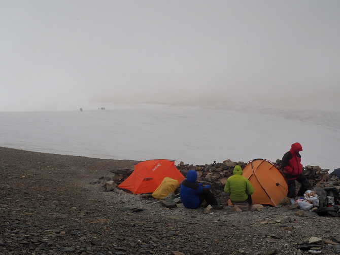 Сегодня, 19 августа, по погоде решили выехать в 4 утра, т.к. была гроза. В 5-00 вышли от 5100 сквозь снежную крупу и туман к вершине. Юля с Артёмом не захотели идти дальше, не видя смысла из-за плохой видимости. Они повернули обратно от конца косой полки, но надо  отдать должное, 5300 тоже не плохо. Скажу спасибо Березину и Семенову за поставленные часто вешки!